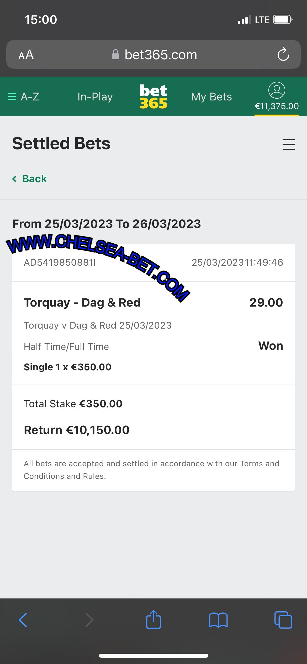 BET365 FROM (15/03) 29.00 ODDS WON